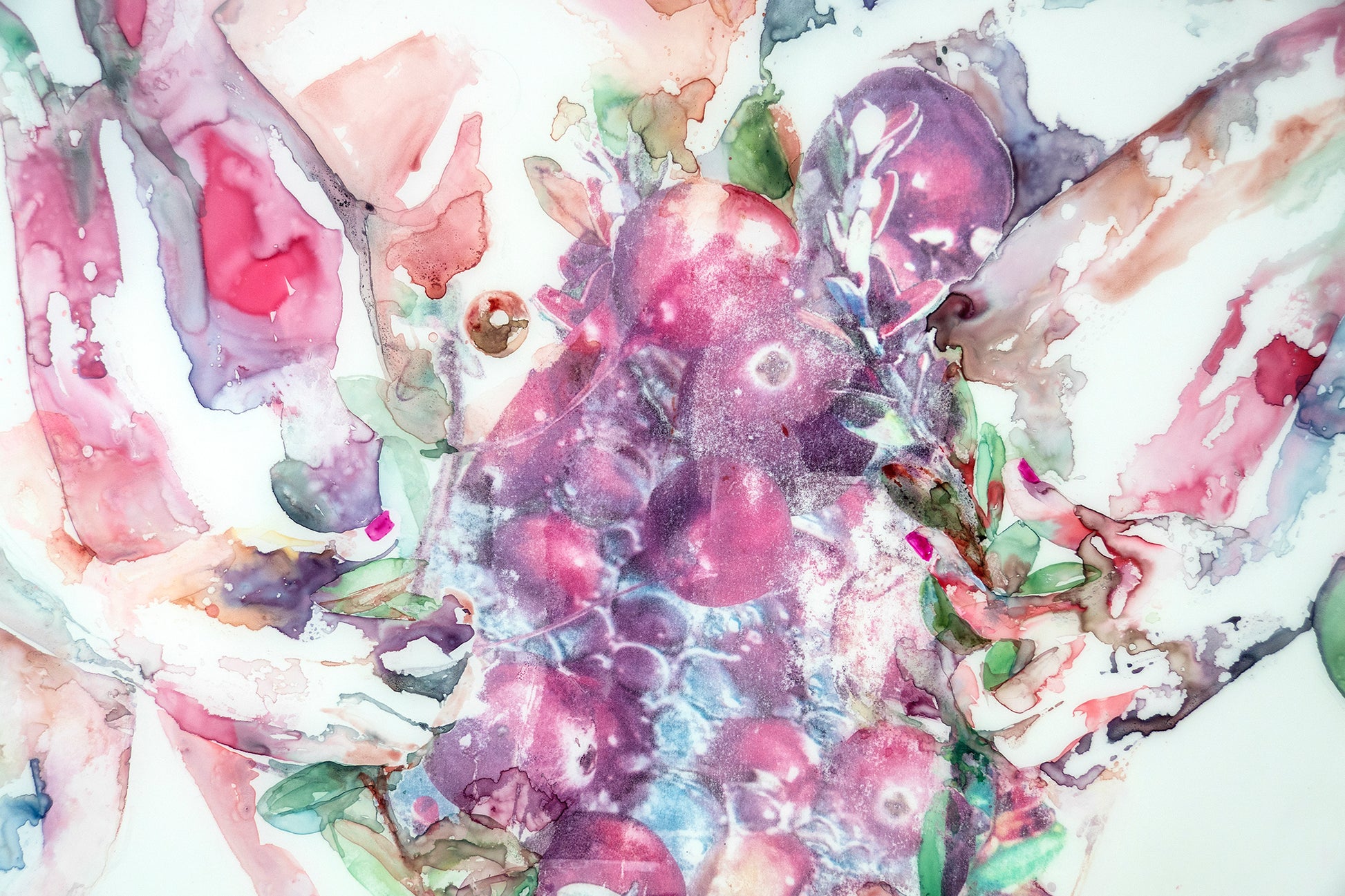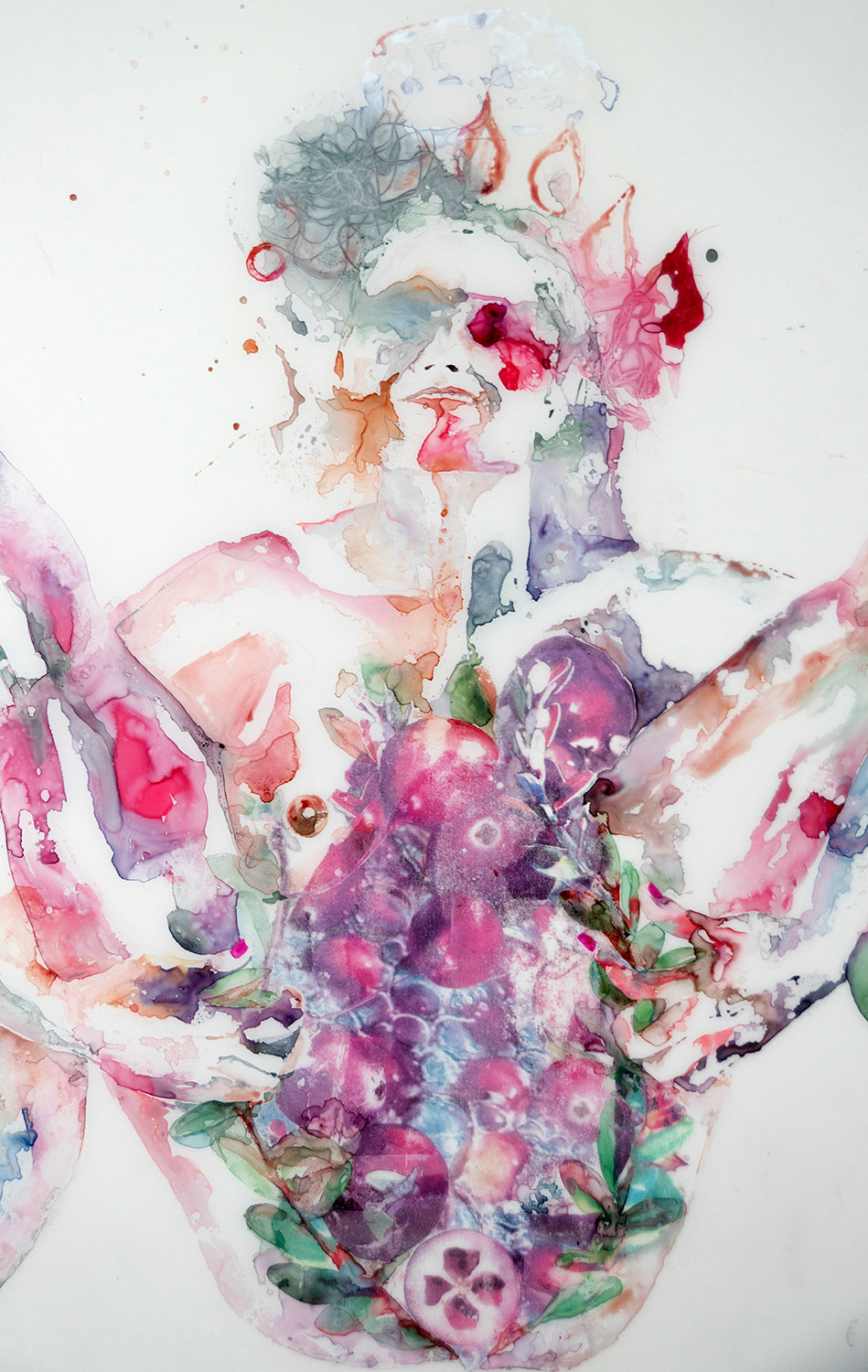 "I reference the Sheela-Na-Gig, a mysterious fertility statue found across medieval Europe, in all her yonic glory. From her insides spew a bubbling bunch of cranberries, an image transfer of a photograph I took during the harvest of my family’s cranberry farm. Made during an artist residency in the wine-rich Italian area of Piedmont, I equate the area’s own agricultural fertility with that of my origins on New England cranberry bog: the title “Spumadonna” combines Italian words for “bubbling” (as in the sparkling wine Spumante) and “woman”.