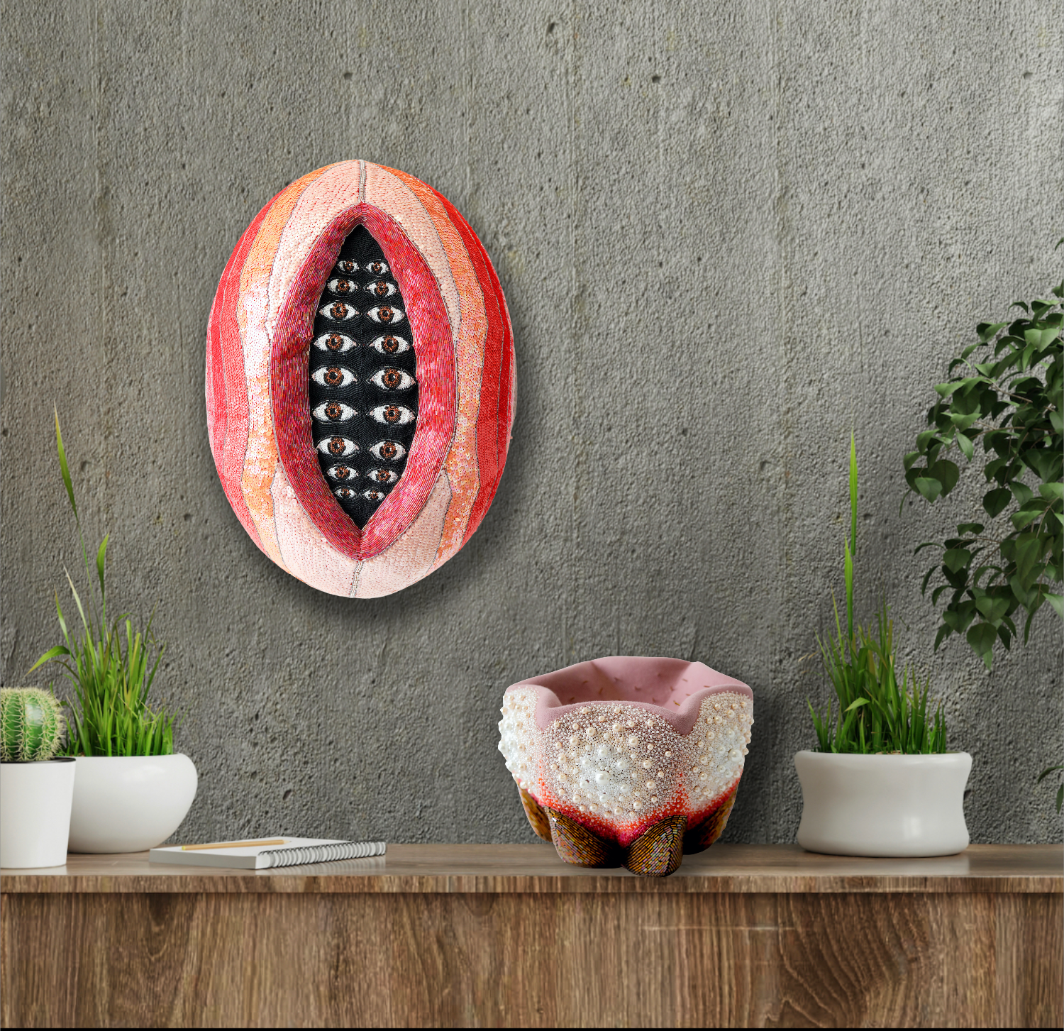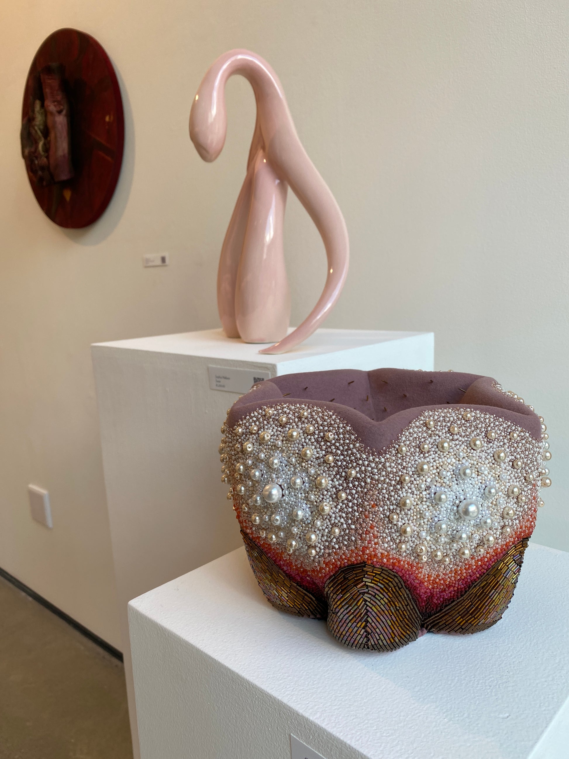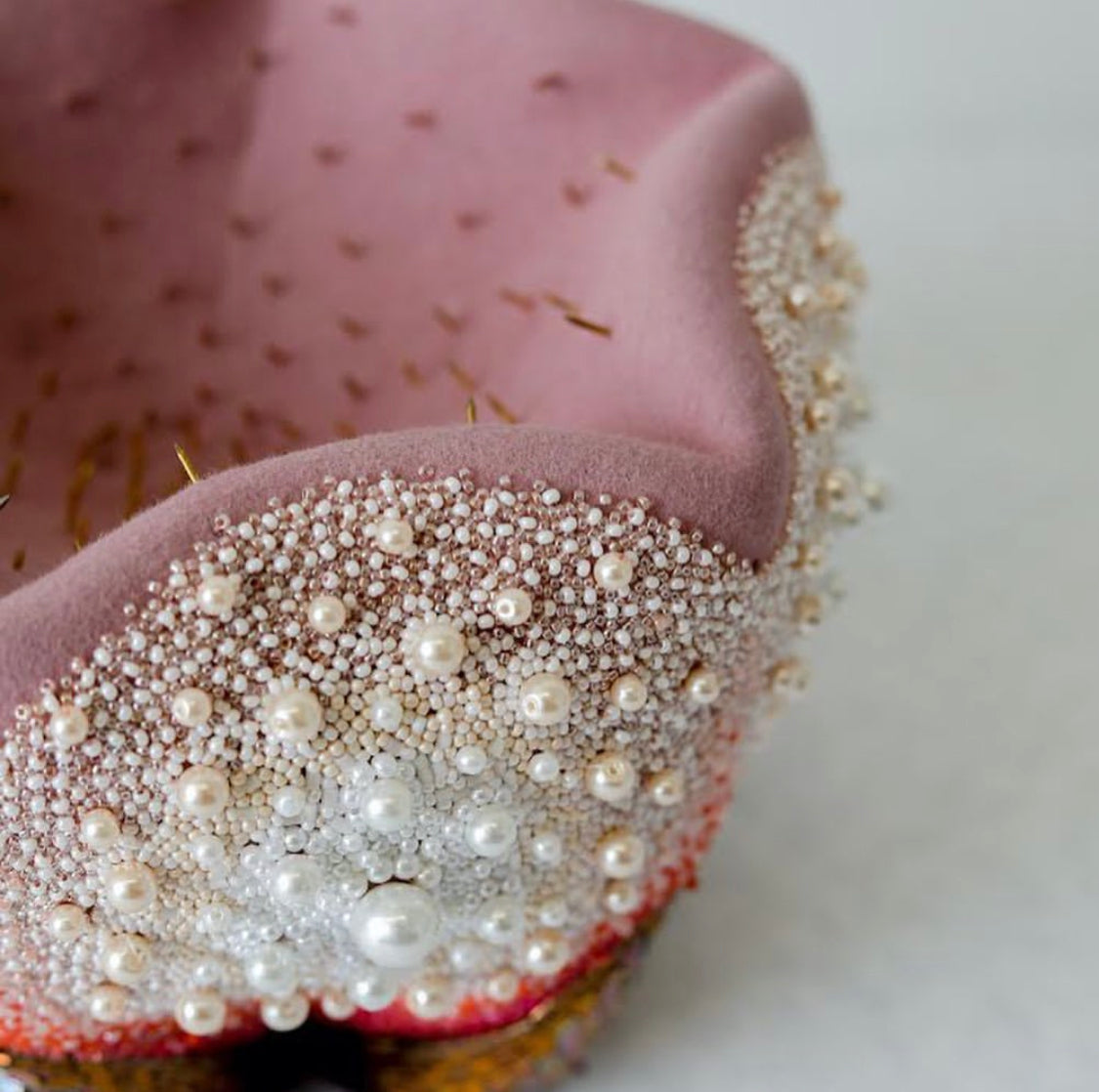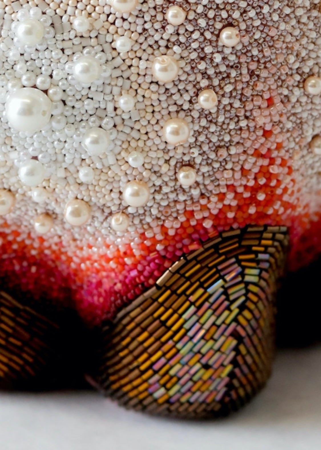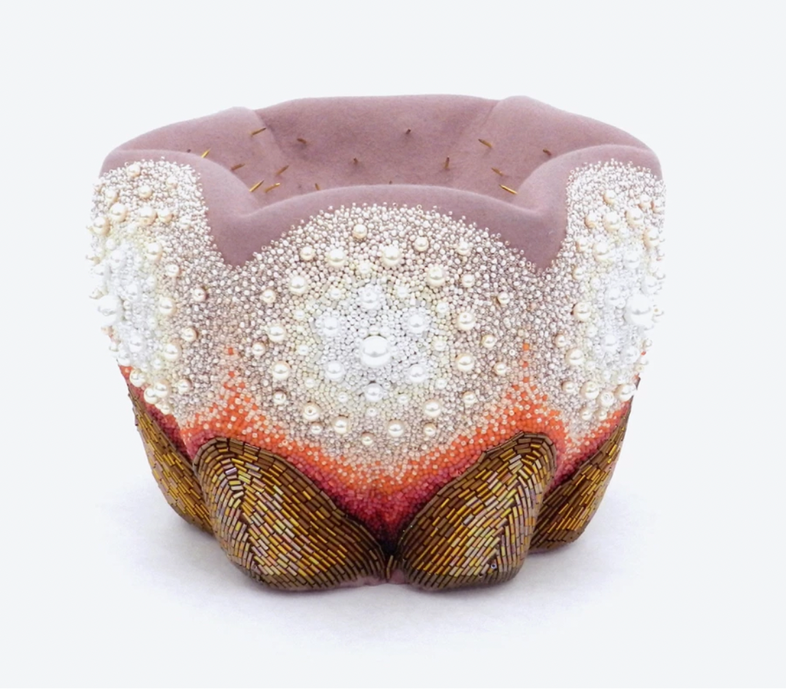 "Communicating through craftsmanship, I use couture millinery and embellishment techniques in meticulously beaded sculptures to Illustrate personal stories of childhood trauma, sexuality, intimacy, and growth. The regular use of spiraling, both as a meditative process and visual symbol, serves as an expression of love consciousness and alignment with the helical rhythm of the universe - essential practices in holistic healing, emotional evolution, and the clearest communication with all things. Seeking spiritual expansion through this work is a necessary pursuit since my mission as a storyteller is to recount deeply traumatic stories of a survivor of CPTSD for the same cultural collective that due to repression, denial, censorship, and deliberate silencing, has barely built a tolerance to acknowledging the reality that is the prevalence of childhood sexual abuse. Beginning with an open heart, and speaking through symbolism, softness, and aesthetics, I hope to bring this content to a public platform in a way that might offer an audience the space and time to digest the underlying narrative rather than immediately reject it upon recognition. Beauty, light, and love can often serve as our entry point into deeper considerations when it feels too difficult to see through the dark."
