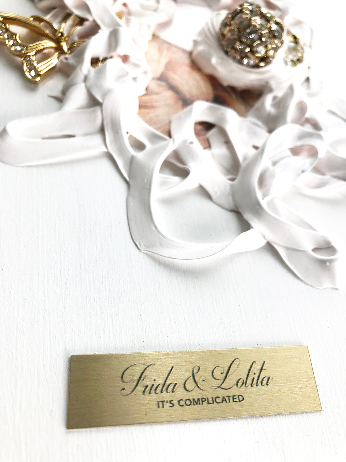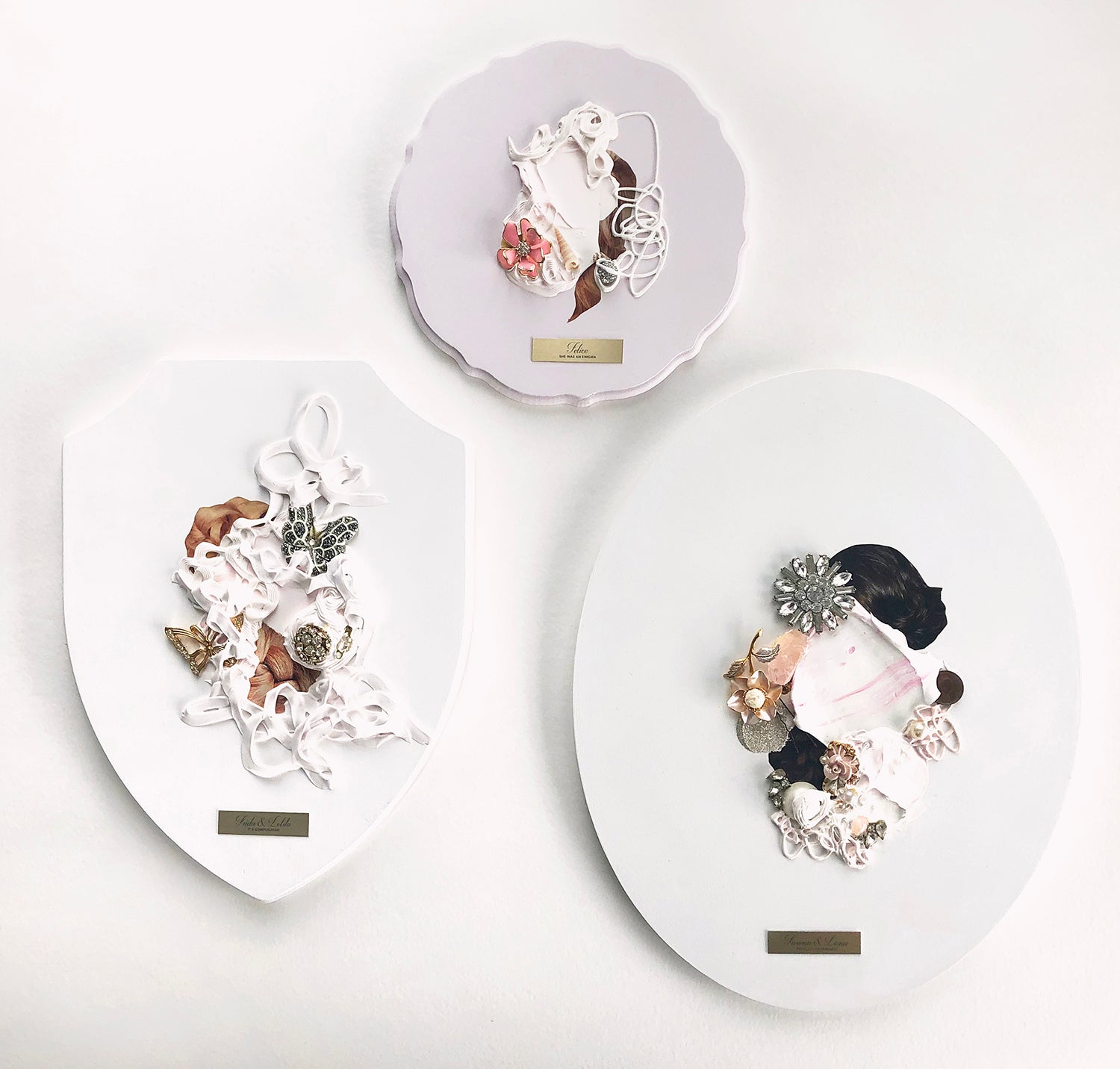 2019, acrylic paint, found jewelry, seashells, brass plate on wood panel, Various sizes, 8” round, 9”x12” shield, 11" x 14" oval