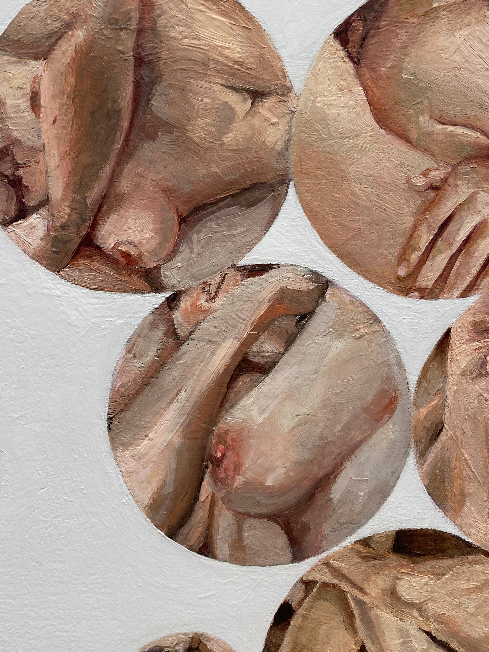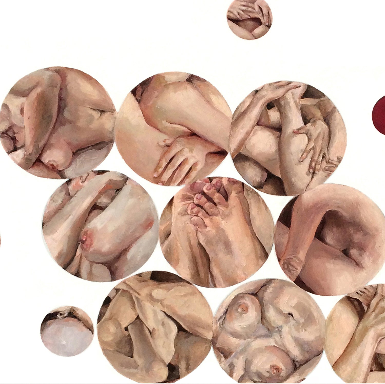 "I am interested in the systems people create in order to organize what they perceive in the world around them. These systems can be based in science, religion, psychology, philosophy or politics. No matter how cerebral a system or idea may appear, it is always experienced through our physical senses. In order to communicate balance between reason and the senses I paint imagery of the body expressing emotional understanding juxtaposed with systems of verbal and/or mathematical reasoning."