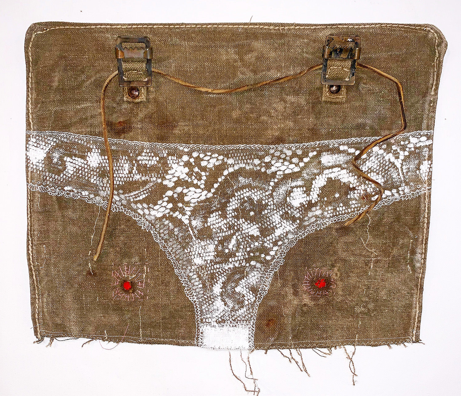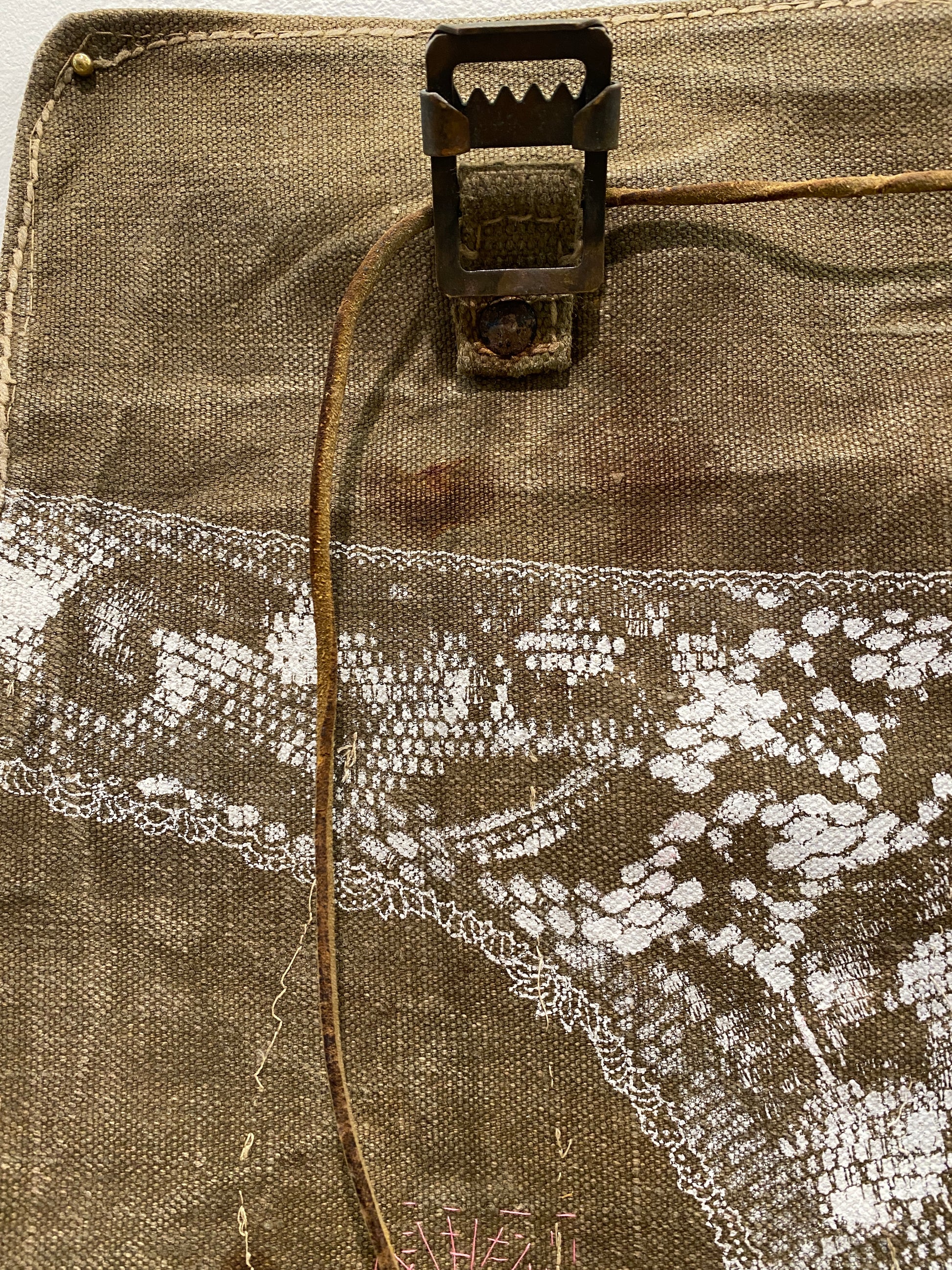 2018, gesso, acrylic, embroidery on Vintage US army fabric, 14" x 11''