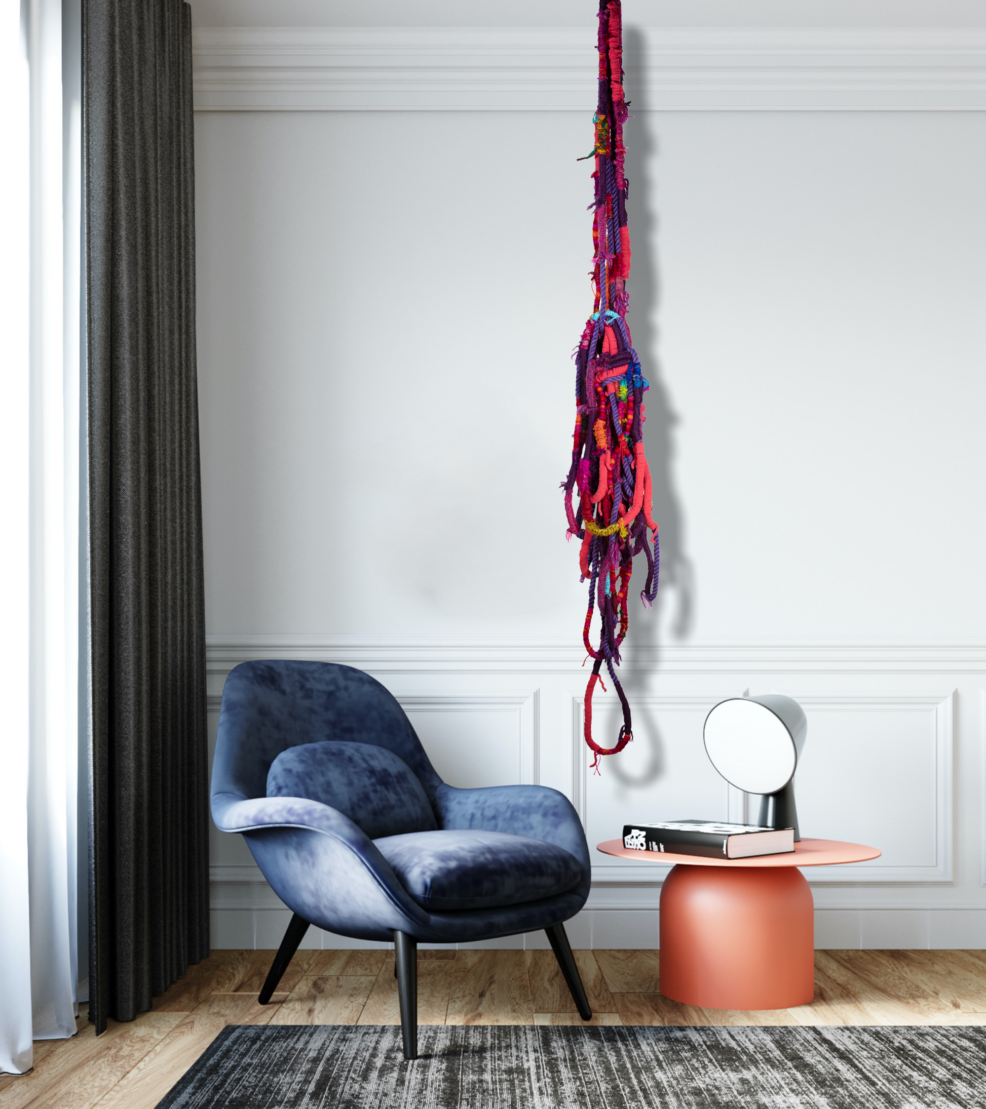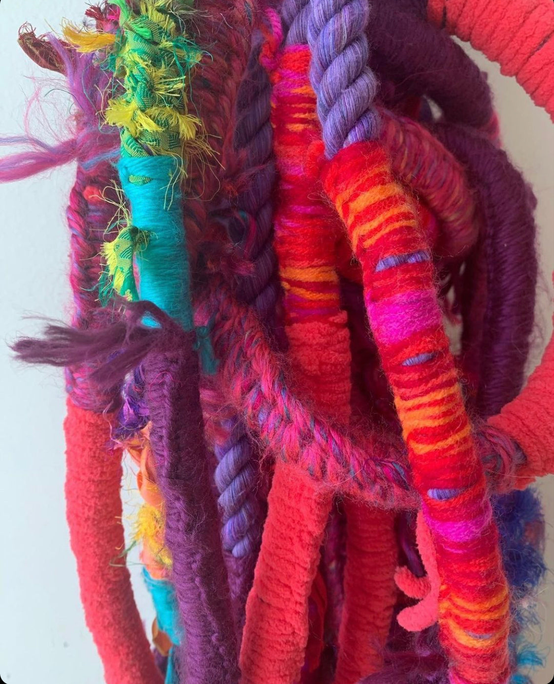 Extensions of rope, twine, and yarn impeccably wrapped, woven, tied and embellished with recycled beads, ribbon, lace, tape and bottle cap bobbles lure you into a hue-imbued, installations symbolizing natural hair. These bold whimsically twisted locks gingerly invite the audience into off the-wall conversations about microaggressions against black women and our hair.