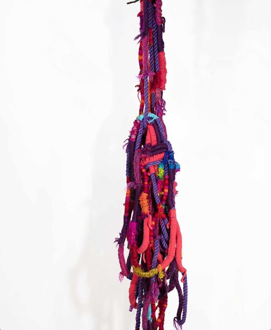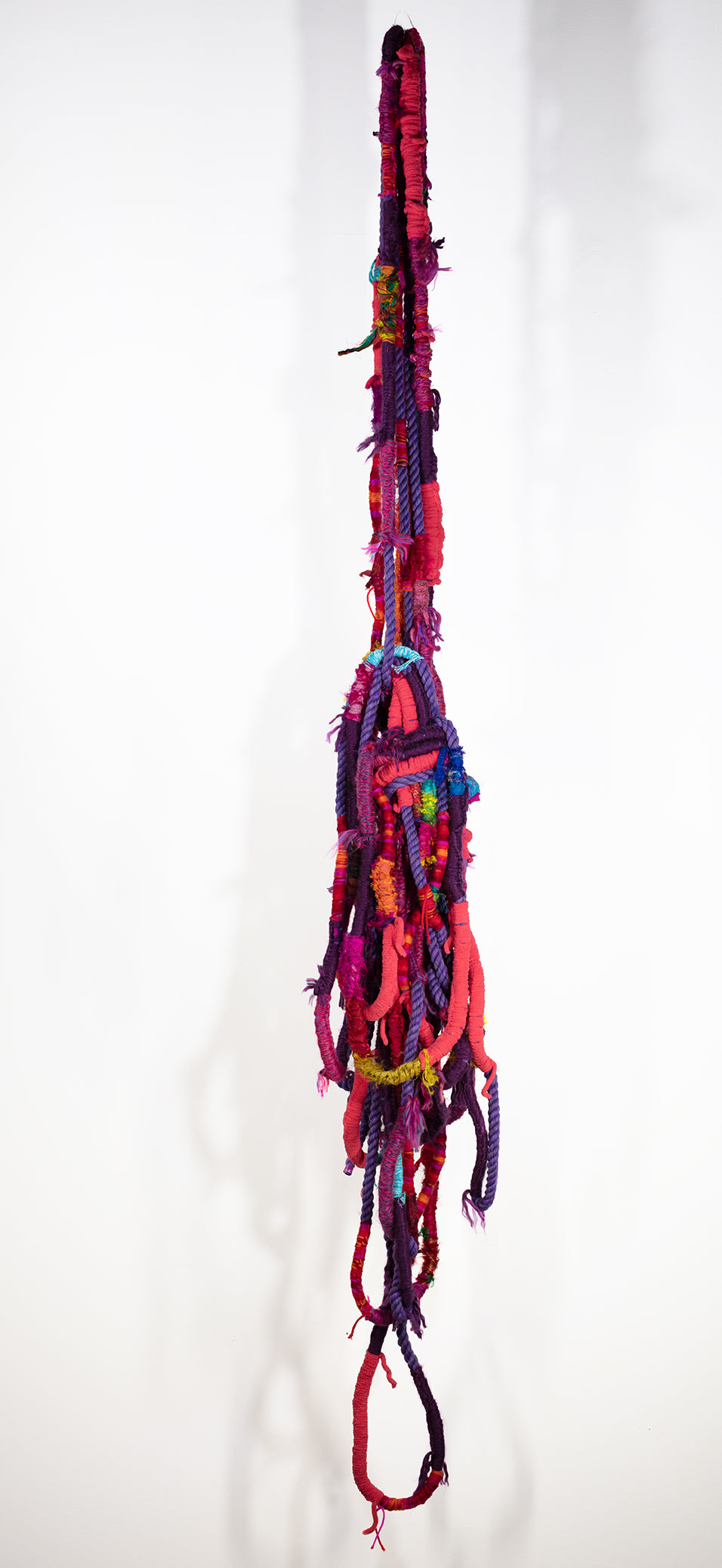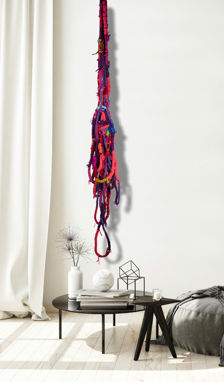 2019, Mixed media cotton rope, yarn, chenille and recycled sari silk, Size (h w d): 80 x 10 x 12 in. These are the colors of twilight off the bow of our boat in the Caribbean